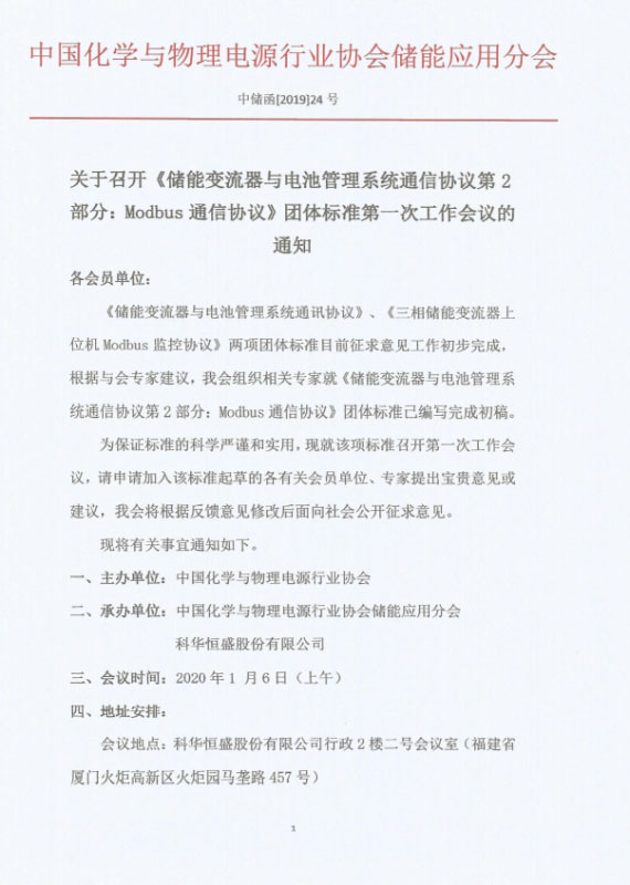關(guān)于召開《儲(chǔ)能變流器與電池管理系統(tǒng)通信協(xié)議第2部分:Modbus通信協(xié)議》團(tuán)體標(biāo)準(zhǔn)第一次工作會(huì)議的通知
