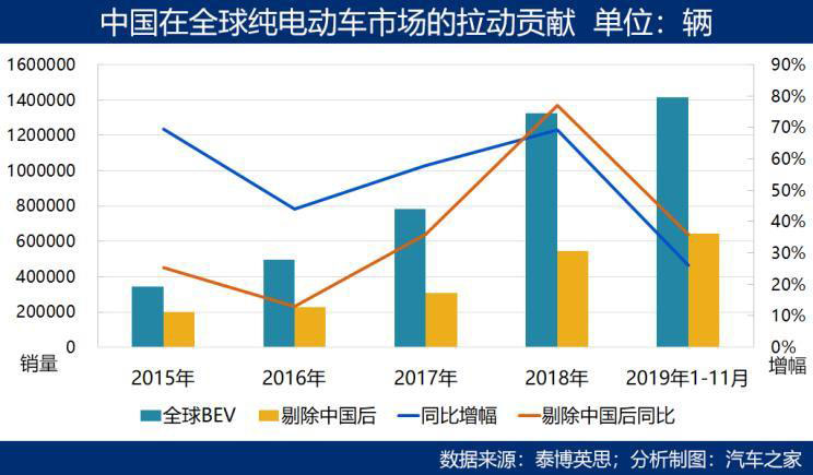 今年前十一個(gè)月,全球純電動(dòng)汽車(chē)?yán)塾?jì)銷(xiāo)量的同比增幅是26%,剔除中國(guó)市場(chǎng)以后,同比增幅增加為36%。2019年是中國(guó)電動(dòng)汽車(chē)補(bǔ)貼退出幅度最大的一年,本地市場(chǎng)因此在下半年出現(xiàn)了五連跌,沒(méi)有高額補(bǔ)貼護(hù)體的中國(guó)電動(dòng)車(chē),放慢了腳步。