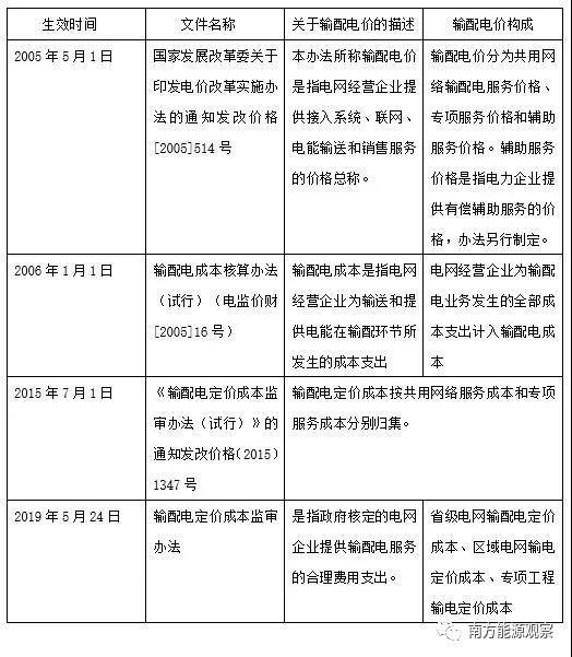 電化學儲能在電力系統(tǒng)內可以承擔多種應用,對于電網(wǎng)側儲能,有的應用屬于輔助服務的范疇,如調峰調頻、冷熱備用、黑啟動等;有的屬于輸配電服務范疇,如延緩線路擴容、緩解線路阻塞、調壓和輸電線路熱管理等。而電力資產通過電價疏導的方式主要有兩種,一是“準許成本+合理收益”的方式;另外一種方式是通過市場的方式,價格高低由供需關系決定。若電化學儲能只從事輸配電服務相關的業(yè)務,其成本應該被計入輸配電價;而從事輔助服務這部分成本對應的電價則是輔助服務電價。只是到目前為止,輔助服務機制(市場)還是各種發(fā)電機組之間的“零和游戲”,現(xiàn)行輸配電價中不包含輔助服務電價。按照國家能源局發(fā)布的輔助服務市場推進的時間表來看,這部分成本最終將疏導到終端電價。筆者查閱了2002年以來關于輸配電價構成的相關政策,如下表所示: