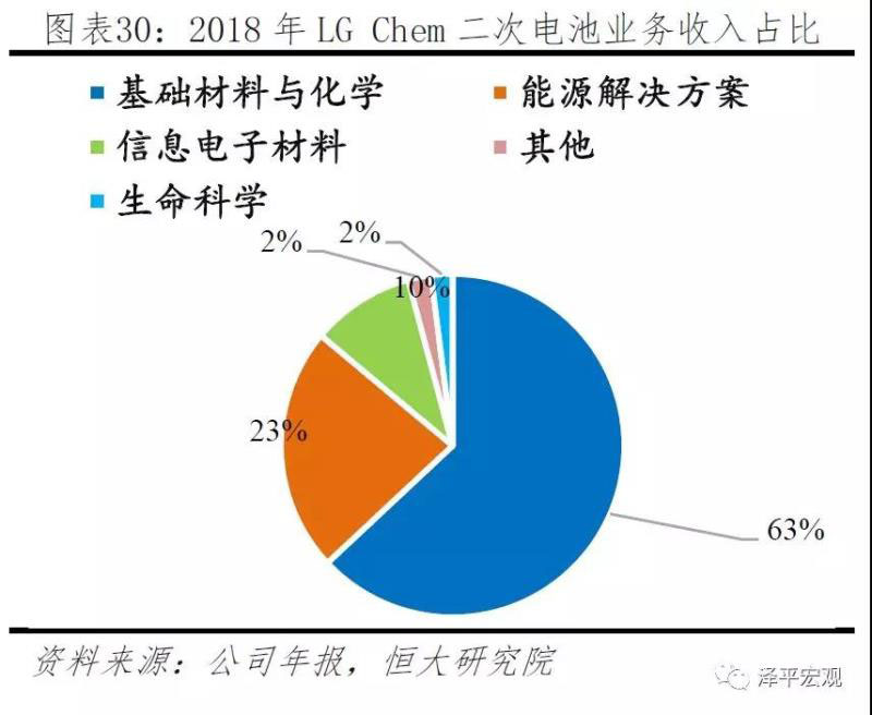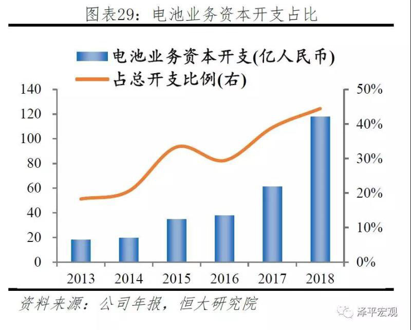 LG Chem高度重視動(dòng)力電池板塊,年資本投入占比超40%。LG Chem為LG電子集團(tuán)子公司,公司以化學(xué)和材料業(yè)務(wù)起家,1998年開始進(jìn)入鋰電池領(lǐng)域,對(duì)于化學(xué)材料具有深刻的理解,在正極、隔膜、電解液方面具有雄厚的技術(shù)積累。公司積極布局動(dòng)力電池業(yè)務(wù),電池業(yè)務(wù)資本開支逐年提高,2018年超過100億,總開支占比超過40%,動(dòng)力電池帶來的收入占比為23%。