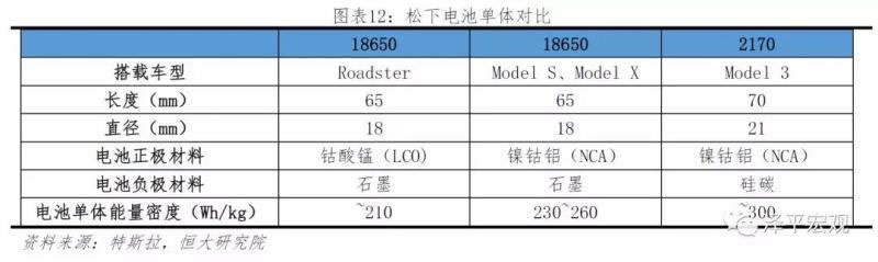 松下與特斯拉深度綁定,采用鎳鈷鋁酸鋰(NCA)路線,并以18650和21700圓柱電池聞名。橫向來看,當(dāng)競爭對(duì)手2013年做磷酸鐵鋰電池與NCM111時(shí),特斯拉和松下已經(jīng)著手使用NCA三元電池;當(dāng)競爭對(duì)手2017年開始由低鎳材料過渡到NCM622/NCM811高鎳正極材料時(shí),特斯拉和松下探索更高能量密度的硅碳負(fù)極應(yīng)用。縱向來看,特斯拉和松下一直堅(jiān)持使用NCA作為電芯正極材料,并不斷提高鎳含量、降低鈷含量。對(duì)比最新Model 3與Roadster兩款汽車,特斯拉平均每款車鈷含量降低約60%。根據(jù)特斯拉2018年一季度報(bào)告,Model 3的電芯能量密度超過其他任何一款競品所使用的電芯,其鈷含量低于主流電芯制造廠即將量產(chǎn)的下一代NCM811電芯產(chǎn)品。