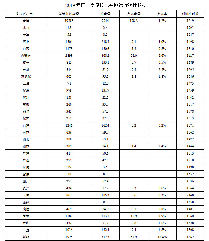 2019年1-9月,平均利用小時數(shù)較高的省份是云南(2148小時)、四川(1936小時)。2019年1-9月,棄風仍較為嚴重的地區(qū)是新疆(棄風率15.4%、棄風電量57.9億千瓦時)、甘肅(棄風率8.9%、棄風電量16.9億千瓦時)、內(nèi)蒙古(棄風率6.6%、棄風電量32.0億千瓦時)。