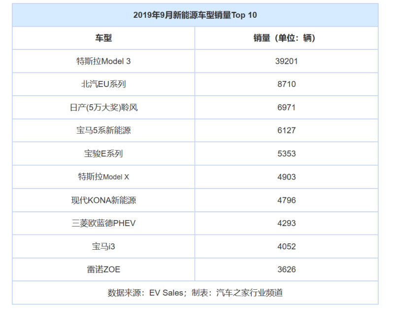 在人們以往認(rèn)知中,中國新能源車型通常會占全球銷量排名前十強(qiáng)的一半以上,而如今凈僅剩兩款產(chǎn)品的境況令人唏噓。且嚴(yán)格來講,上榜的中國新能源產(chǎn)品并非一款車,其中寶駿E系列包含寶駿E100及寶駿E200,北汽EU系列則包含EU260、EU400、EU5等車型。而反觀特斯拉和寶馬,則各有兩款車型上榜,尤其特斯拉Model 3以超越排名第二的北汽EU系列30491輛的成績獲得2019年全球新能源汽車銷量冠軍。