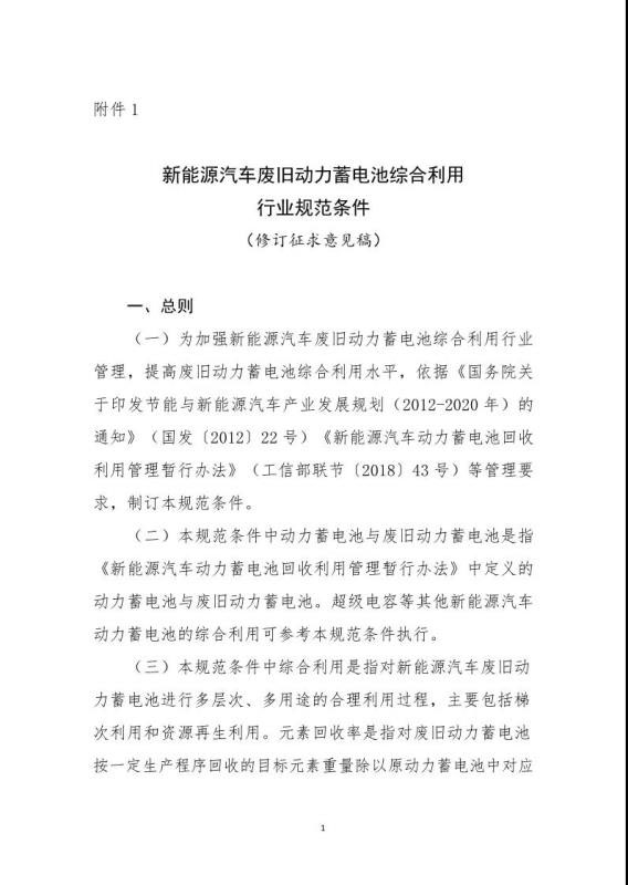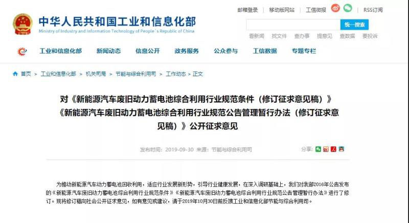 中國儲能網(wǎng)訊:9月30日,工信部發(fā)布了對《新能源汽車廢舊動力蓄電池綜合利用行業(yè)規(guī)范條件(修訂征求意見稿)》、《新能源汽車廢舊動力蓄電池綜合利用行業(yè)規(guī)范公告管理暫行辦法(修訂征求意見稿)》公開征求意見。