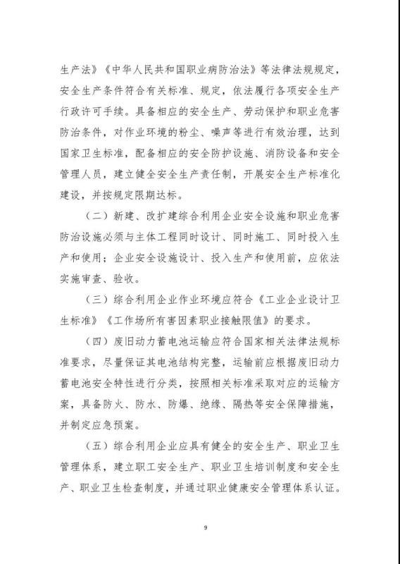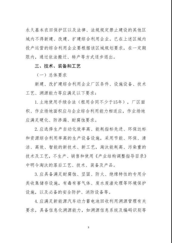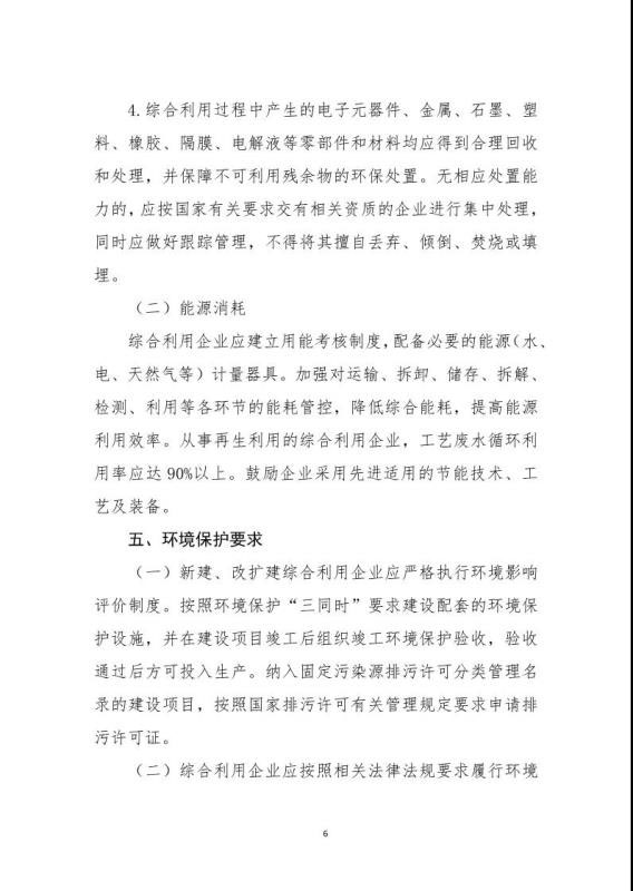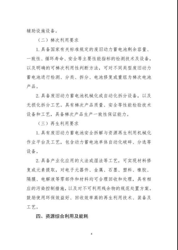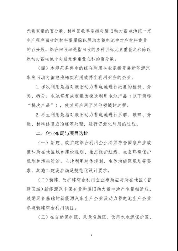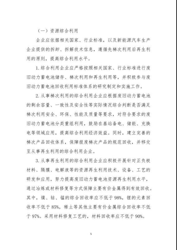 《規(guī)范條件》指出綜合利用企業(yè)是指開展新能源汽車廢舊動力蓄電池梯次利用或再生利用業(yè)務的企業(yè),該文件鼓勵具備基礎的新能源汽車生產企業(yè)及動力蓄電池生產企業(yè)參與新建綜合利用項目,鼓勵從事梯次利用的綜合利用企業(yè)在基站備電、儲能、充換電等領域應用,提高綜合利用經(jīng)濟效益。