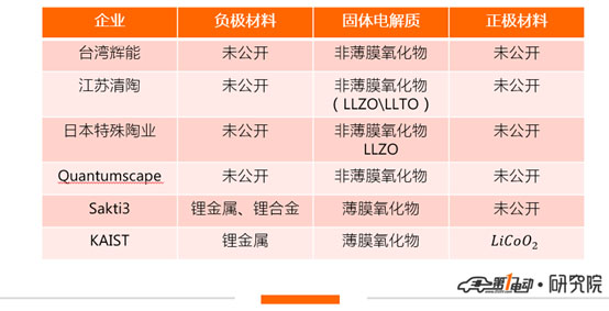 最后來看看氧化物體系,它主要分為薄膜型與非薄膜型兩大類,非薄膜型產(chǎn)品憑借較高導(dǎo)電率、相對(duì)低的生產(chǎn)成本以及相對(duì)平衡的各項(xiàng)指標(biāo),已成為中國(guó)企業(yè)重點(diǎn)開發(fā)的方向,臺(tái)灣輝能與江蘇清陶都是此賽道的知名玩家。