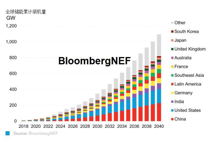 全球儲能市場累計裝機(jī)規(guī)模將從2018年的9GW/ 17GWh增長到2040年的1,095GW/ 2,850GWh,總投資額達(dá)6620億美元。