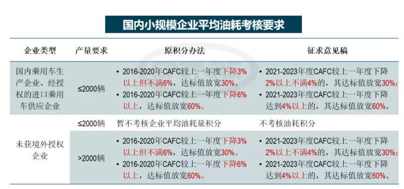 《征求意見稿》中延續(xù)前期做法,對小規(guī)模企業(yè)繼續(xù)給予了油耗積分的核算優(yōu)惠,對企業(yè)平均燃料消耗量降幅要求進一步放寬??紤]小規(guī)模企業(yè)產(chǎn)品存在結(jié)構(gòu)單一、新能源產(chǎn)品缺乏的特征,在2020年后繼續(xù)降油耗的潛力有限,在油耗下降要求方面給予一定程度的放寬,此舉有利于促進我國汽車市場產(chǎn)品多樣化發(fā)展。