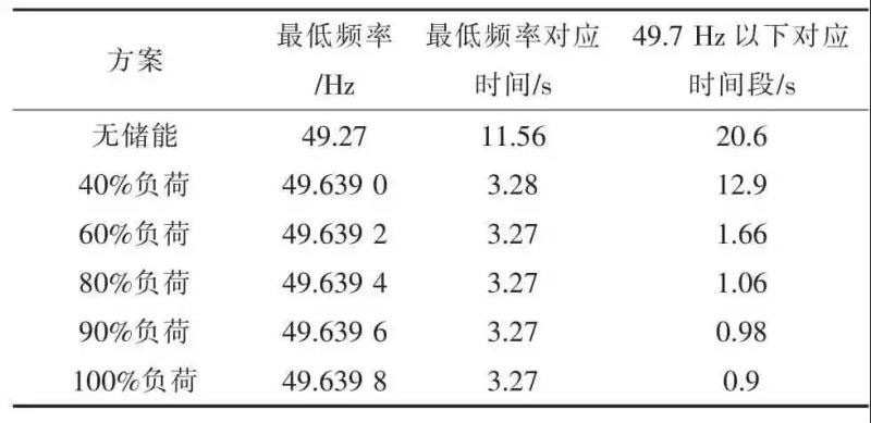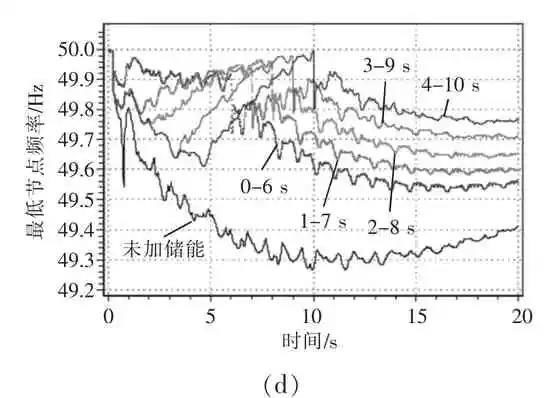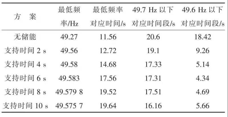 由圖4(a), 4(b), 4(c)可以看出, 儲能裝置的支持對發(fā)電機(jī)功角、 功率和母線電壓均有穩(wěn)定作用, 但不同支持時長的效果區(qū)別不是很明顯。圖4(d)顯示, 不同的儲能裝置支持時長對系統(tǒng)最低頻率點(diǎn)的改善效果區(qū)別比較明顯。儲能裝置支持時長較短的, 由于支持能量有限, 頻率在一開始有點(diǎn)回升但較慢, 整個系統(tǒng)頻率是在一次調(diào)頻作用下才回升較快;而儲能裝置支持時長較長的, 頻率在一開始暫升較多些, 這樣推遲了一次調(diào)頻動作時間, 等到儲能裝置放電完成后, 整個系統(tǒng)頻率才在一次調(diào)頻作用下穩(wěn)定回升, 導(dǎo)致系統(tǒng)頻率最低點(diǎn)對應(yīng)的時間有所不同, 處于較低頻率時間較長。從表2 中可以看出, 儲能裝置支持時間為2 s 和10 s 時, 系統(tǒng)頻率低于49.6 Hz 的時間均超過了5 s, 支撐的效果相對較差。而另外支持時長在4~8 s, 反而效果較好, 這是與一次調(diào)頻動作配合比較協(xié)調(diào)所致。因此對于系統(tǒng)頻率穩(wěn)定性來講, 適當(dāng)?shù)膬δ苋萘恐С謺r長比較合適, 不是越長越好。相比于儲能容量支持時長,在大功率缺額的初期, 儲能裝置提供足夠的功率支持對系統(tǒng)最低頻率影響更大。