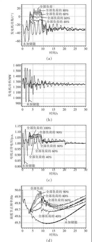 由圖5(a), 5(b), 5(c)可知, 儲能裝置容量變化對發(fā)電機(jī)功角、 功率以及母線電壓暫態(tài)穩(wěn)定改善效果與上面仿真結(jié)果大同小異, 重點(diǎn)還是在頻率上。通過對比圖5(d)母線上頻率變化曲線,可以發(fā)現(xiàn)在儲能支持期間(第3-9 s), 儲能裝置支持功率越大, 對頻率的提升效果越好, 但如果儲能裝置總?cè)萘亢头烹姇r間有限, 頻率暫時過多的提升反而延緩了一次調(diào)頻的作用, 使得系統(tǒng)頻率的最低點(diǎn)推遲時刻到來, 整體系統(tǒng)的頻率調(diào)整較慢。恰當(dāng)?shù)膬δ苤С止β剩?與一次調(diào)頻配合, 總體效果是最好的, 安裝容量過大或過小, 都會影響其對系統(tǒng)的頻率支撐水平。從表3 中可以看出,當(dāng)支持容量為紹興地區(qū)負(fù)荷的40%以下時, 系統(tǒng)頻率整體在49.7 Hz 以下, 無法進(jìn)行良好的頻率支撐;當(dāng)儲能裝置容量為紹興地區(qū)負(fù)荷的100%時, 系統(tǒng)運(yùn)行15 s 后, 頻率迅速下落, 也無法達(dá)到理想效果。圖5 顯示儲能裝置容量為紹興地區(qū)負(fù)荷的80%(即5 221.6 MW)時頻率恢復(fù)效果最為理想, 最低頻率較高, 49.7 Hz 下持續(xù)時間較短, 該功率約為直流閉鎖缺額功率(7 800 MW)的66%。