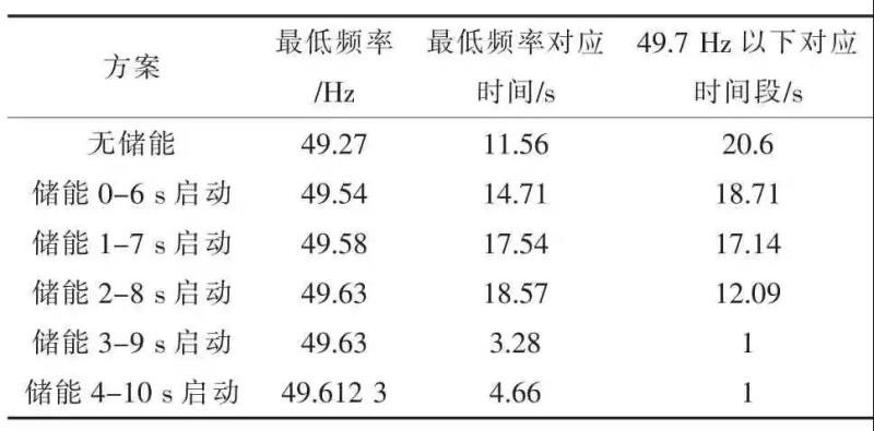 從圖3(a), 3(b), 3(c)可以看出, 儲能裝置的支持對發(fā)電機(jī)功角、 功率和母線電壓的最后穩(wěn)定都有改善作用。圖3(d)顯示, 儲能裝置的支持可以改善系統(tǒng)頻率最低點(diǎn), 以免低頻減載裝置動作。但儲能裝置容量和放電時間有限, 越早啟動儲能裝置支持, 響應(yīng)速度快, 在初期頻率很快有較好的回升, 下降較小。但等到儲能裝置放電完成后, 此時仍存在功率缺額, 而由于一次調(diào)頻是根據(jù)頻率偏差來啟動的, 儲能裝置的放電減少了系統(tǒng)的功率缺額, 頻率下降較小, 導(dǎo)致一次調(diào)頻功率還沒能完全調(diào)整上來, 需要一定的調(diào)頻時間啟動一次調(diào)頻功率, 整個系統(tǒng)頻率又會跌下去,系統(tǒng)最低頻率反而較低, 達(dá)不到系統(tǒng)頻率恢復(fù)最好結(jié)果。如果太晚啟動儲能裝置, 由于一次調(diào)頻啟動較慢, 頻率已經(jīng)下降到最低點(diǎn), 儲能裝置對于提高系統(tǒng)最低頻率沒有效果。綜合比較, 儲能裝置動作時機(jī)不是越早越好, 也不是越晚越好。從圖3 可以看出, 從3 s 開始儲能支持, 9 s 時結(jié)束, 母線電壓與發(fā)電機(jī)功角、 功率的振蕩幅度更小。從表1 中也可以看出整體頻率維持在49.7 Hz以上時間最長, 對于頻率的支撐效果最好。
