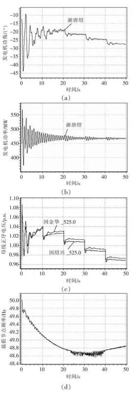 靈紹直流和賓金直流都發(fā)生雙極閉鎖時, 仿真曲線如圖2 所示。可以看出, 當(dāng)靈紹、 賓金2 條直流雙極閉鎖時, 系統(tǒng)功率缺額更大, 浙江電網(wǎng)發(fā)電機(jī)功角和功率、 電壓發(fā)生較大波動, 頻率降得更低。但在本身內(nèi)網(wǎng)機(jī)組和外網(wǎng)機(jī)組一次調(diào)頻作用下, 在經(jīng)過3~4 個一次調(diào)頻時間常數(shù)周期后,最終系統(tǒng)也能夠穩(wěn)定, 系統(tǒng)頻率最低為48.6 Hz,下降到49 Hz 以下, 會導(dǎo)致低頻減載裝置動作。