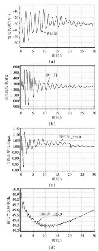 從圖1 可以看出, 靈紹直流雙極閉鎖后, 原來由直流輸送的2×3 900 MW 功率轉(zhuǎn)移到交流線路上, 導(dǎo)致功率波動和頻率下降, 在此過程浙江電網(wǎng)發(fā)電機(jī)功角和功率、 電壓均發(fā)生較大的波動,圖1(a)為唐紹發(fā)電機(jī)功角曲線、 圖1(b)為三門發(fā)電機(jī)功率曲線、 圖1(c)為紹興某變電所500 kV母線正序電壓曲線、 圖1(d)為系統(tǒng)頻率曲線。由于系統(tǒng)的一次調(diào)頻根據(jù)頻率的偏差來啟動, 且慣性時間常數(shù)較大, 一般為4~10 s。從圖1 中可以看出, 浙江電網(wǎng)的一次調(diào)頻時間常數(shù)約為10 s,在本身內(nèi)網(wǎng)機(jī)組和外網(wǎng)機(jī)組一次調(diào)頻作用下和負(fù)荷的調(diào)節(jié)效應(yīng)作用下, 發(fā)電機(jī)功率輸出增加, 負(fù)荷消耗功率減少, 頻率開始回升, 最終系統(tǒng)能夠穩(wěn)定, 頻率最低為49.27 Hz。