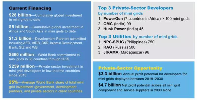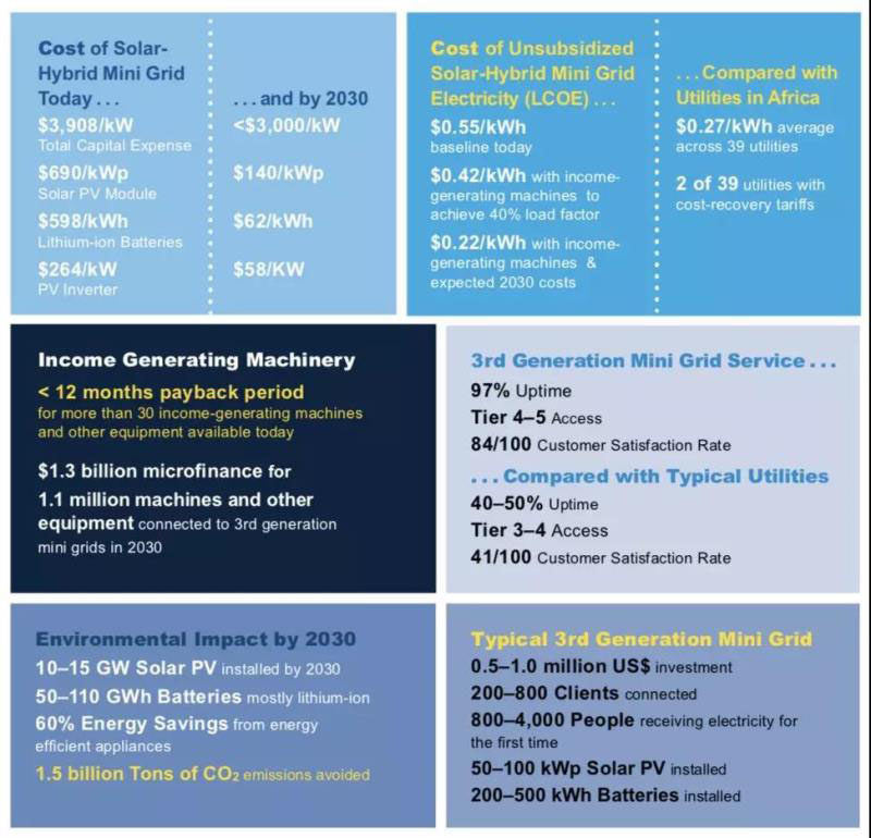 2030年的目標:微電網(wǎng)數(shù)量達到21萬(以太陽能為基礎的多能互補),為4.9億人口供電,總投資2200億美元。