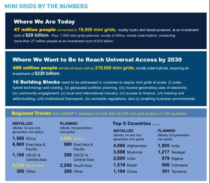 全球共有19,000個微電網(wǎng)(水電、柴油發(fā)電為主,其中16200個在亞洲和太平洋地區(qū)),為4700萬人供應電力,總投資約為280億美元。此外還有7500個微電網(wǎng)(其中4000在非洲)正在籌劃建設中,可為2700萬人供電,總投資120億美元。