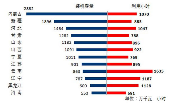 圖5 1-5月份風電裝機較多省份風電裝機容量和設備利用小時