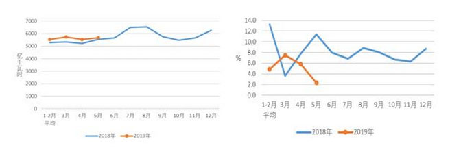 圖1 2018、2019年分月全社會用電量及其增速