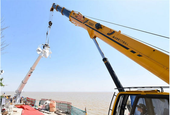 4月15日,500余噸水泥基礎(chǔ)平臺安全澆筑完成,進入養(yǎng)護期。項目經(jīng)理岳付昌介紹說:“風(fēng)機的架設(shè)是我們整個工程建設(shè)的關(guān)鍵點和難點。開山島地處黃海前哨,島上怪石嶙峋,施工環(huán)境既復(fù)雜又惡劣,給我們工程設(shè)計和施工帶來了很多困難。在這種惡劣環(huán)境下將500多噸水泥成功澆筑,既是全體施工人員學(xué)習(xí)傳承時代楷模精神的最佳實踐,也為未來的海島微電網(wǎng)建設(shè)提供了重要示范?!?水泥基礎(chǔ)平臺養(yǎng)護期結(jié)束后,國網(wǎng)江蘇電力開始風(fēng)力發(fā)電機組建工作。