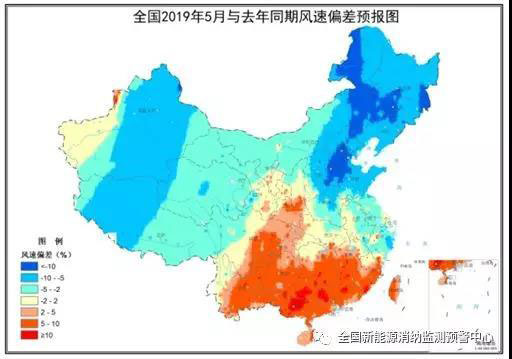 全國(guó)2019年4月(上圖)、5月(中圖)、6月(下圖)與去年同期風(fēng)速偏差預(yù)報(bào)圖(數(shù)據(jù)來(lái)源:中國(guó)氣象局風(fēng)能太陽(yáng)能資源中心)