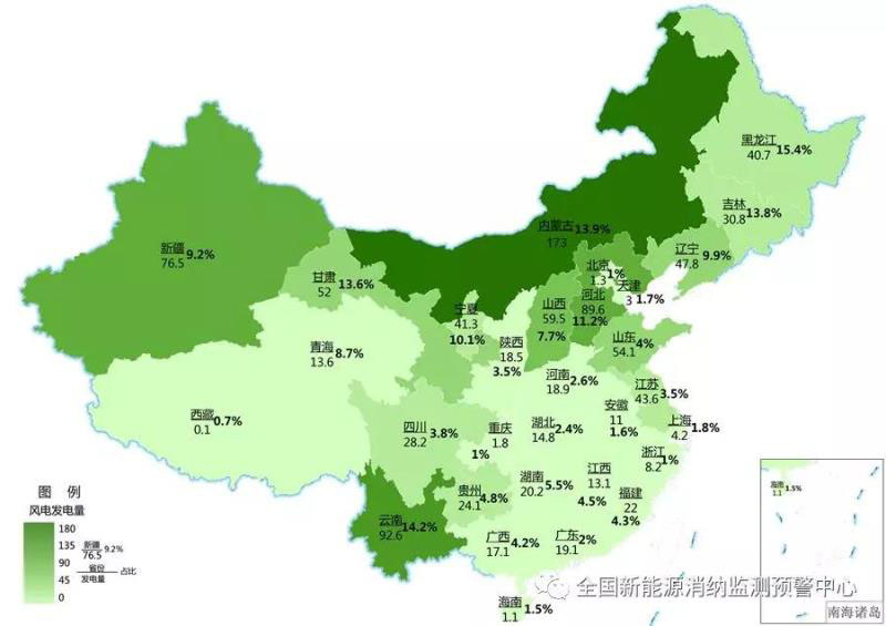 一季度各地區(qū)風(fēng)電發(fā)電量及占本地區(qū)總發(fā)電量比重