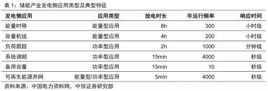 從發(fā)電側(cè)的角度看,儲能的需求終端是發(fā)電廠。由于不同的電力來源對電網(wǎng)的不同影響,以及負載端難預(yù)測導(dǎo)致的發(fā)電和用電的動態(tài)不匹配,發(fā)電側(cè)對儲能的需求場景類型較多,包括能量時移、容量機組、負荷跟蹤、系統(tǒng)調(diào)頻、備用容量、可再生能源并網(wǎng)等六類場景。
