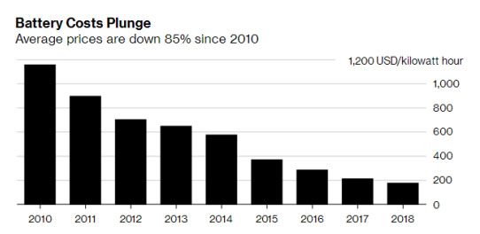 鋰離子電池價格自2010年到2018年的平均價格下降了85%