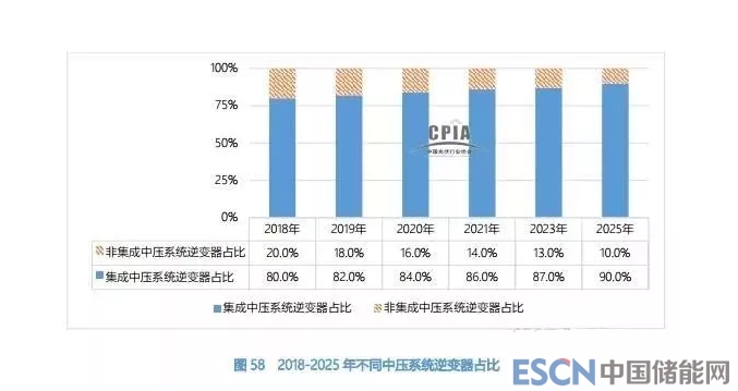 2018 年集成中壓系統(tǒng)逆變器占比達(dá)到了 80%,預(yù)計(jì)到 2025 年集成中壓系統(tǒng)逆變器將占到九成。