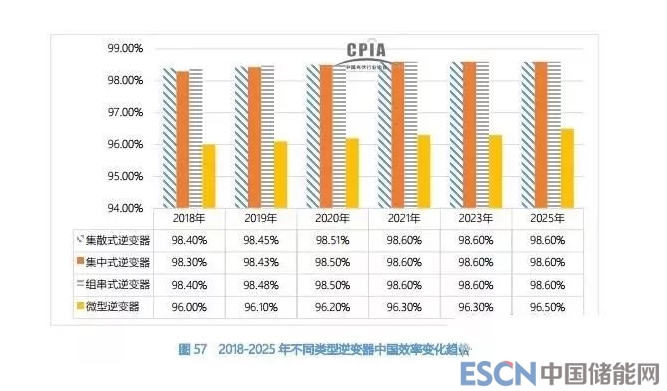 下圖給出了 2018-2025 年不同類型逆變器中國(guó)效率變化趨勢(shì)。