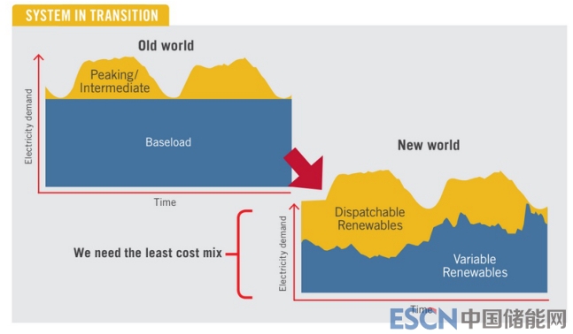 該報(bào)告明確指出,電網(wǎng)正在從“舊世界”向“可再生能源主導(dǎo)的世界”轉(zhuǎn)變,舊世界以煤炭發(fā)電為主,天然氣發(fā)電成本更高一些,而可再生能源發(fā)電以成本較高的儲(chǔ)能系統(tǒng)或可調(diào)度發(fā)電為主。這就是彭博新能源財(cái)經(jīng)公司創(chuàng)始人Michael Liebreich所描述的圍繞“基礎(chǔ)成本”可再生能源建立的系統(tǒng)。