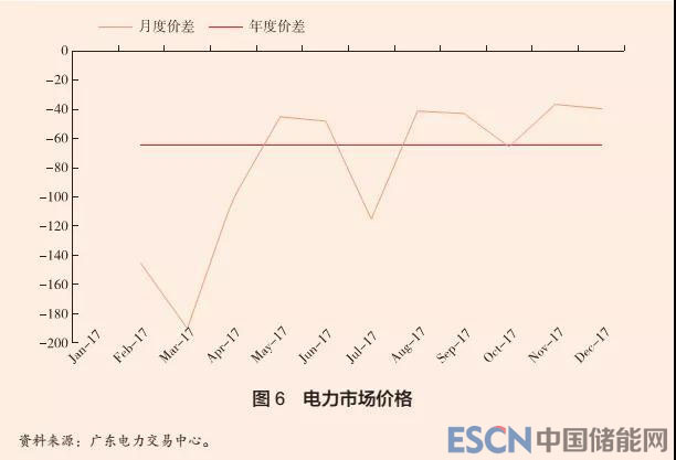 廣東月度電力市場(chǎng)價(jià)格,實(shí)際上只是與管制零售價(jià)格的價(jià)差( Li and Shen, 2016)。最大價(jià)差是 -500 個(gè)基點(diǎn)( 1 個(gè)基點(diǎn) =0.001 元 / 千瓦時(shí))。當(dāng)前市場(chǎng)覆蓋了 4000 個(gè)大型用戶。典型的大型用戶包括通信公司和金屬工廠等企業(yè)。年度市場(chǎng)的價(jià)差大約是 64.5 個(gè)基點(diǎn)( 0.0645 元 / 千瓦時(shí)),月度市場(chǎng)的價(jià)差在此基礎(chǔ)上上下波動(dòng)(見(jiàn)圖 6),而且這種波動(dòng)會(huì)體現(xiàn)在一天的不同時(shí)間里(峰、平均、谷),幅度為正負(fù) 0.3 元 / 千瓦時(shí)。 2018 年,電力市場(chǎng)將覆蓋180 TWh 的用電需求和所有的天然氣、核電、風(fēng)電和水電。南方電網(wǎng)將為所有發(fā)電企業(yè)的發(fā)電量支付同一個(gè)管制價(jià)格,而電力市場(chǎng)將為用煤和氣發(fā)電的企業(yè)提供一個(gè)他們?cè)敢饨邮艿?、相比于管制價(jià)格的價(jià)差。