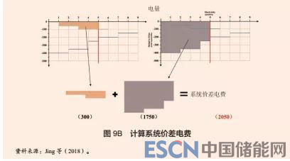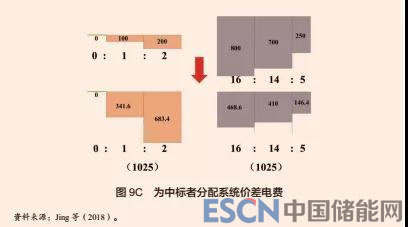 在圖 9A 中,有 3 個(gè)售電公司(購(gòu)電方)和 3 個(gè)發(fā)電企業(yè)(供電方)在拍賣(mài)中中標(biāo)。發(fā)電企業(yè)的最低報(bào)價(jià)是以 -400 的相對(duì)價(jià)格供應(yīng) 2 個(gè)單位的電量。市場(chǎng)出清價(jià)格應(yīng)該是 -200(供給曲線與固定交易量曲線的交叉點(diǎn)),所有售電公司都應(yīng)該支付這個(gè)價(jià)格。在圖 9B 中,總消費(fèi)者剩余( 300)用橙色表示,總生產(chǎn)者剩余( 1750)用紫色表示。兩者相加就是系統(tǒng)的價(jià)差電費(fèi)( 2050)。在圖 9C 中,系統(tǒng)的價(jià)差電費(fèi)總額被對(duì)半分配給中標(biāo)的售電公司和發(fā)電企業(yè),然后,每個(gè)售電公司或發(fā)電企業(yè)再分別根據(jù)各自在總消費(fèi)者剩余或總生產(chǎn)者剩余中的份額得到相應(yīng)的價(jià)差電費(fèi)。例如,在中標(biāo)的售電公司當(dāng)中報(bào)價(jià)第二低的那個(gè)公司的消費(fèi)者剩余是 100,這等于總消費(fèi)者剩余的 1/3 ( 100/300),所以該公司分配到的價(jià)差電費(fèi)是 1025 的 1/3,即 341.6。在圖 9D 中,價(jià)差電費(fèi)被轉(zhuǎn)換成價(jià)格。計(jì)算方法是將每個(gè)中標(biāo)公司或企業(yè)的價(jià)差電費(fèi)除以它的購(gòu)售量。例如,報(bào)價(jià)第二低的售電公司需要支付的價(jià)差是 -170.8(即 -341.6 除以 2)。