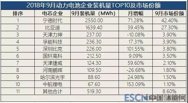寧德時代吃掉的是誰的市場份額?排在后面的天津力神、孚能科技、深圳比克、國軒高科,這些電芯企業(yè)9月的裝機(jī)市場份額都只稍高于3%,而上個月他們的市場份額尚在4-7%之間。