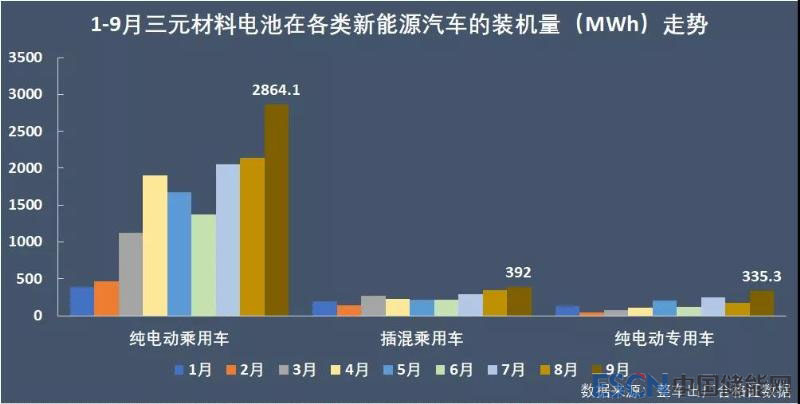 不過,同期累計(jì)相比,去年前9個月三元材料電池的裝機(jī)比重僅為49.52%,今年三元材料電池裝機(jī)量的高比重系商用車市場總體不景氣、磷酸鐵鋰電池大戶純電動客車的產(chǎn)量一直低迷所致。