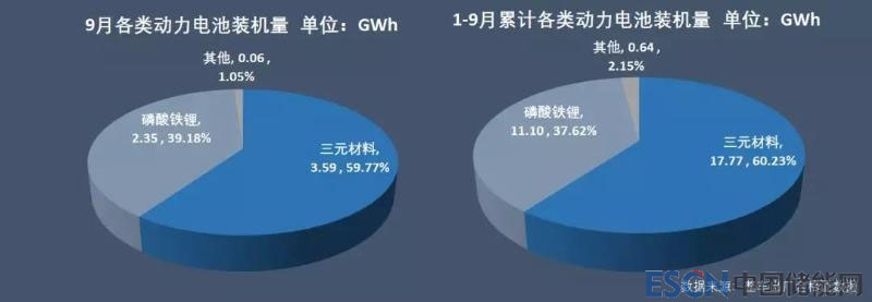 9月,磷酸鐵鋰電池在總體裝機(jī)量中的比重也從上個月的35.09%增加到39.16%,三元鋰電池的比重從上個月的63.2%下降到59.76%。