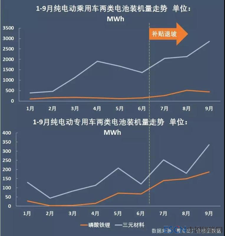 事實(shí)上,補(bǔ)貼退坡后三個月,磷酸鐵鋰電池裝機(jī)上漲勢頭強(qiáng)于三元鋰電池。