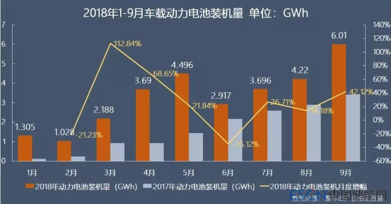 9月份,國內(nèi)新能源汽車動力電池裝機(jī)量6.01GWh,較上月增長42.12%,增幅提升明顯;同比亦大幅增長75.43%,較前兩個月的增幅繼續(xù)回升。