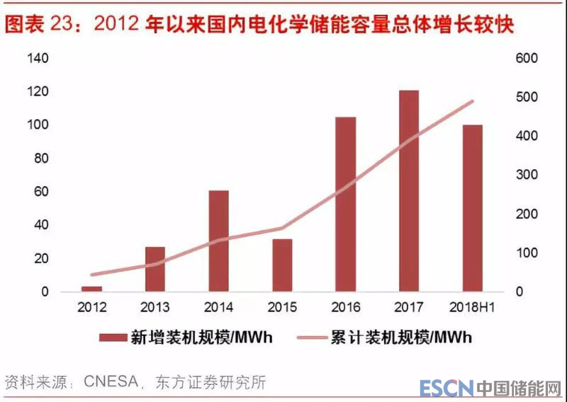 截至 2017 年底,中國(guó)已投運(yùn)儲(chǔ)能項(xiàng)目累計(jì)裝機(jī)規(guī)模 28.9GW,同比增長(zhǎng) 19%。抽水蓄能的累計(jì)裝機(jī)規(guī)模占比最大,接近 99%,但較上年有所下降。電化學(xué)儲(chǔ)能的累計(jì)裝機(jī)規(guī)模為 389.8MW,同比增長(zhǎng) 45%,所占比重為 1.3%,較上一年增長(zhǎng) 0.2 個(gè)百分點(diǎn)。在各類電化學(xué)儲(chǔ)能技術(shù)中,鋰離子電池的累計(jì)裝機(jī)占比最大,比重為 58%。2018 年上半年國(guó)內(nèi)新增鋰電池裝機(jī) 100.2MWh,同比增長(zhǎng)133%。