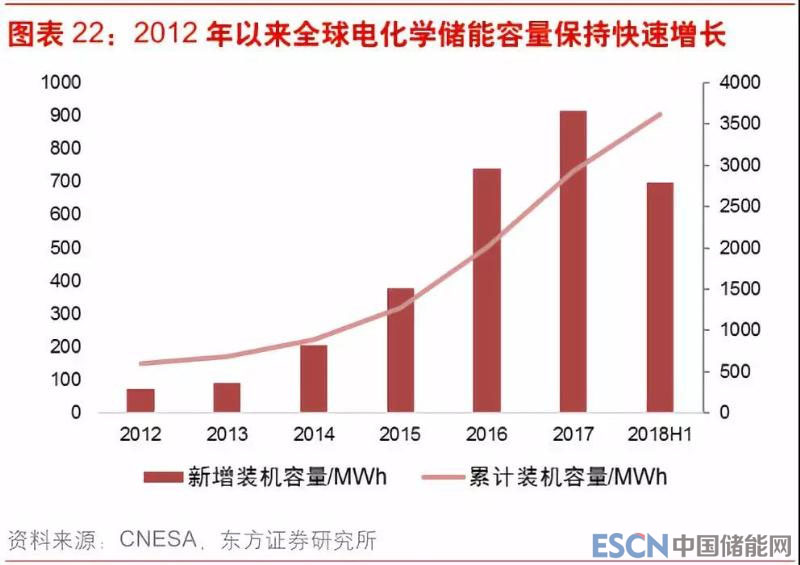 在新近發(fā)展的各項(xiàng)儲(chǔ)能技術(shù)中,鋰電池儲(chǔ)能在能量密度、功率密度、循環(huán)次數(shù)、成本等方面的綜合優(yōu)勢(shì)極為突出,也成為近年來(lái)新增儲(chǔ)能容量的最主要來(lái)源。2017年全球新增儲(chǔ)能電池容量914.1MWh,其中鋰離子電池占比達(dá)93%;國(guó)內(nèi)新增儲(chǔ)能電池容量100.4MWh,其中鋰離子電池占比達(dá)58.5%。