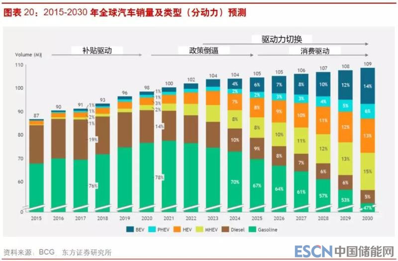 在前TCO平價(jià)階段,由于成本仍然缺乏競(jìng)爭(zhēng)力,電動(dòng)車(chē)過(guò)去幾年的高速增長(zhǎng)主要是由政策驅(qū)動(dòng),尤其是補(bǔ)貼政策的驅(qū)動(dòng),此時(shí)產(chǎn)業(yè)處于補(bǔ)貼驅(qū)動(dòng)的時(shí)期;隨著電池成本的下降,電動(dòng)車(chē)與燃油車(chē)的TCO不斷逼近,在部分應(yīng)用場(chǎng)景中電動(dòng)車(chē)甚至已具備TCO成本優(yōu)勢(shì),此時(shí),采用一些非補(bǔ)貼的產(chǎn)業(yè)政策推高燃油車(chē)的使用成本,可以進(jìn)一步提升電動(dòng)車(chē)的滲透率,此時(shí)行業(yè)由政策倒逼來(lái)驅(qū)動(dòng);一旦電池成本突破臨界點(diǎn),電動(dòng)車(chē)的購(gòu)臵成本將占據(jù)優(yōu)勢(shì),行業(yè)也將過(guò)渡到消費(fèi)驅(qū)動(dòng)階段。驅(qū)動(dòng)力切換的內(nèi)因在于動(dòng)力電池成本快速下降,電動(dòng)車(chē)成本競(jìng)爭(zhēng)力持續(xù)增強(qiáng),外部原因在于產(chǎn)業(yè)政策的調(diào)整。