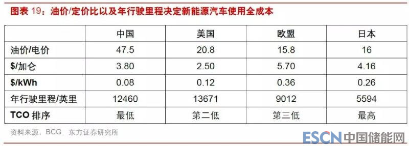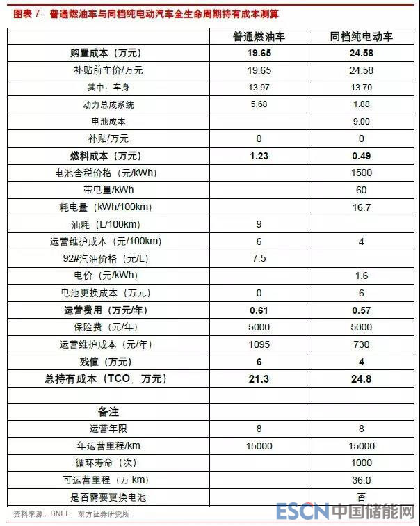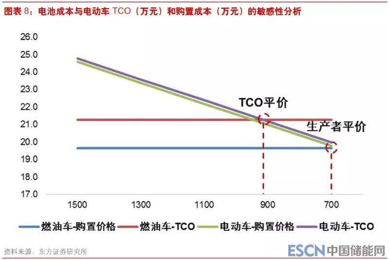 我們構(gòu)建了模型研究不同車(chē)型的購(gòu)臵成本和使用全成本(totalcostofownership,TCO)。在基準(zhǔn)條件下,普通燃油車(chē)的購(gòu)臵成本為 19.6 萬(wàn)元,同檔電動(dòng)車(chē)的購(gòu)臵成本為 24.6 萬(wàn)元,電池成本為1500 元/kWh(含稅);運(yùn)營(yíng)壽命 8 年,每年行駛 15000 公里,車(chē)輛殘值分別為 6 萬(wàn)元和 4 萬(wàn)元。運(yùn)營(yíng)期間燃油車(chē)和電動(dòng)車(chē)的 TCO 分別為 21.3 萬(wàn)元和 24.8 萬(wàn)元。相比而言,燃油車(chē)的購(gòu)臵成本仍然更有競(jìng)爭(zhēng)力,電動(dòng)車(chē)的燃料成本在比較高的電價(jià)之下仍有明顯優(yōu)勢(shì)。