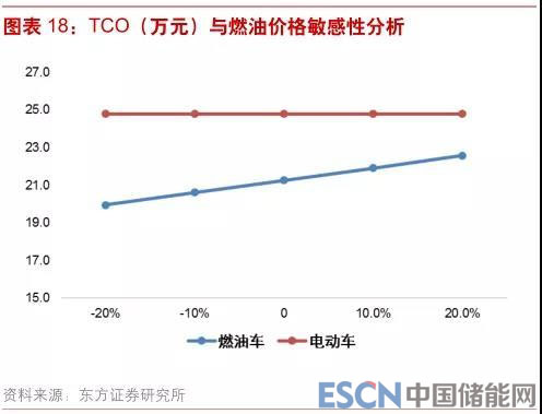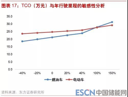 對(duì)影響 TCO 的各項(xiàng)因素進(jìn)行敏感性分析,可以發(fā)現(xiàn)對(duì) TCO 影響最顯著的因素主要是年運(yùn)營(yíng)里程和燃油價(jià)格。當(dāng)年運(yùn)營(yíng)里程增加一倍至 30000 公里/年時(shí),兩種車(chē)的 TCO 接近,當(dāng)進(jìn)一步增加至45000 公里/年時(shí),電動(dòng)車(chē)的 TCO 將比燃油車(chē)低 4 萬(wàn)元。燃油價(jià)格對(duì)于二者 TCO 的影響也比較明顯,當(dāng)油價(jià)從 7.5 元/升下降 20%時(shí),燃油車(chē)的 TCO 優(yōu)勢(shì)將擴(kuò)大至 4.8 萬(wàn)元,當(dāng)油價(jià)上升 20%時(shí),燃油車(chē)的 TCO 優(yōu)勢(shì)將收窄至 2.2 萬(wàn)元。