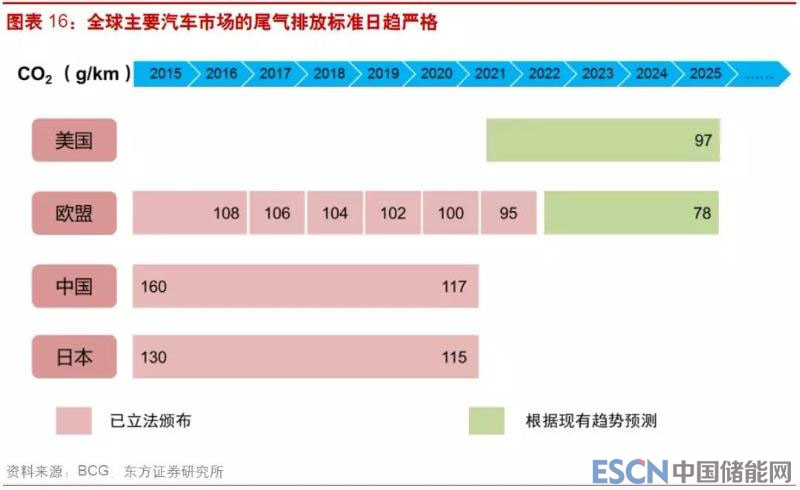 2020 年之后,排放標(biāo)準(zhǔn)進(jìn)一步趨嚴(yán),歐盟希望整車(chē)廠商 2020 年 1 月 1 日前將 CO 的排放量控制在 95g/km,每超出 1g 將對(duì)每臺(tái)車(chē)處以 95 歐元的高額罰款,并計(jì)劃到 2025 年將排放標(biāo)準(zhǔn)進(jìn)一步降低到 78 個(gè)/km 以下。與此同時(shí),燃油車(chē)為滿足要求額外需要投入的成本將快速提高,達(dá)到經(jīng)濟(jì)性瓶頸,據(jù) BCG 估計(jì),假如 2025 年燃油車(chē)排放標(biāo)準(zhǔn)提高到 80~100g/km,將導(dǎo)致每輛燃油車(chē)成本上升 470~580 美元,屆時(shí)盡管新能源汽車(chē)的成本競(jìng)爭(zhēng)力仍不充分,整車(chē)企業(yè)出于達(dá)標(biāo)的要求會(huì)考慮生產(chǎn)一定比例的新能源汽車(chē)。
