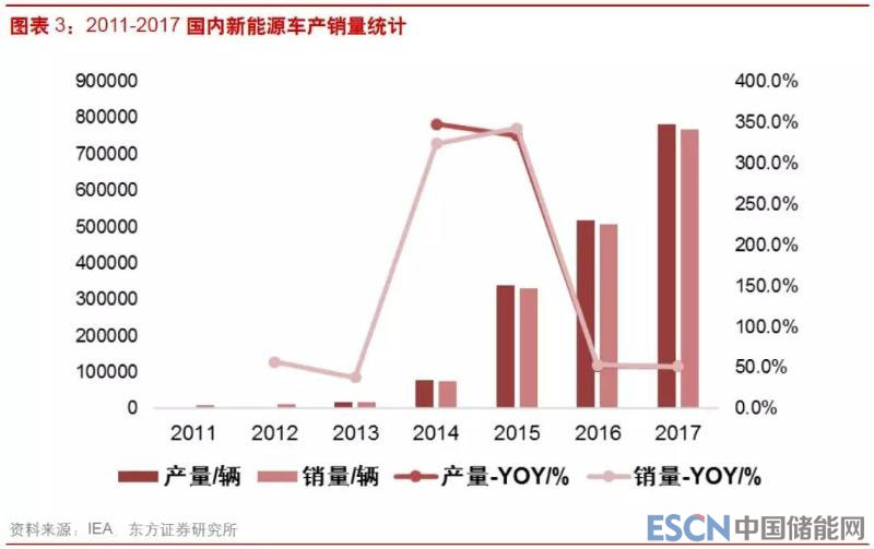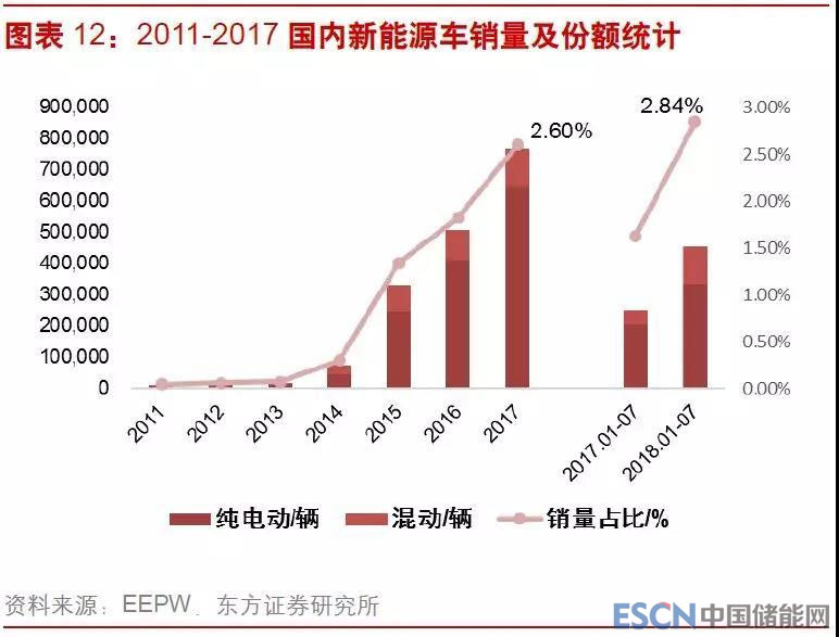 國(guó)內(nèi)新能源汽車(chē)產(chǎn)銷(xiāo)量從2011年不足1萬(wàn)輛增加到2017年近80萬(wàn)輛,6年復(fù)合增速超過(guò)100%,2017年國(guó)內(nèi)新能源汽車(chē)產(chǎn)銷(xiāo)量同比增長(zhǎng)50%以上,2018年以來(lái)繼續(xù)保持高增長(zhǎng),前7個(gè)月國(guó)內(nèi)新能源汽車(chē)產(chǎn)銷(xiāo)量雙雙突破45萬(wàn)輛,同比增長(zhǎng)近80%,占國(guó)內(nèi)汽車(chē)總銷(xiāo)量的比例達(dá)3%以上,汽車(chē)電動(dòng)化的趨勢(shì)已經(jīng)明朗。