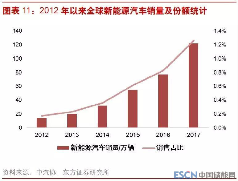 在汽車(chē)電動(dòng)化和儲(chǔ)能需求的推動(dòng)下,2017年動(dòng)力電池和儲(chǔ)能電池的出貨量達(dá)到73GWh,在鋰離子電池的出貨占比超過(guò)一半,當(dāng)前仍處于電動(dòng)化的早期,電動(dòng)車(chē)銷(xiāo)售占比剛剛突破1%,隨著電動(dòng)車(chē)滲透率的提高和儲(chǔ)能市場(chǎng)逐漸打開(kāi),動(dòng)力電池未來(lái)仍有數(shù)十倍的成長(zhǎng)空間。