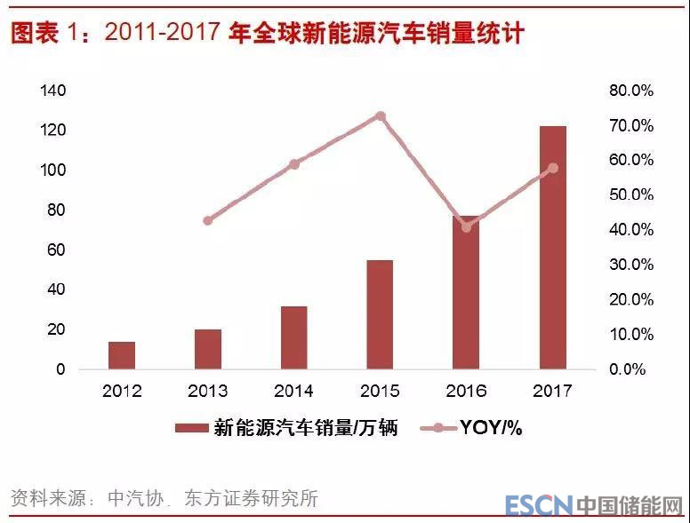 2017年全球新能源汽車(chē)銷(xiāo)量超過(guò)122.3萬(wàn)輛,比2016年增長(zhǎng)58%,推動(dòng)全球新能源汽車(chē)銷(xiāo)量在全球汽車(chē)總銷(xiāo)量當(dāng)中的占比首次突破1%。2012 年以來(lái),國(guó)內(nèi)外新能源汽車(chē)的產(chǎn)銷(xiāo)量持續(xù)高速增長(zhǎng),近五年來(lái)復(fù)合增速達(dá)到 54%。截至 2017 年底,全球累計(jì)新能源車(chē)銷(xiāo)量已接近 400 萬(wàn)輛,占全球汽車(chē)保有量的 0.3%,其中中國(guó)新能源車(chē)?yán)塾?jì)銷(xiāo)量超過(guò) 160 萬(wàn)輛,占全球累計(jì)總量的 42%,除中國(guó)以外的主要市場(chǎng)還包括美國(guó)、日本以及挪威、德國(guó)等歐洲國(guó)家,前十大消費(fèi)國(guó)累計(jì)銷(xiāo)量占全球總量的 93%。