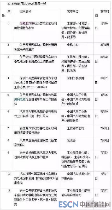 經(jīng)電動汽車資源網(wǎng)統(tǒng)計,2018年前7月,國家及地方共發(fā)布動力電池方面的政策或標準10條,其中7條直接與動力電池回收利用有關,2條和動力電池白名單有關,1條和新建動力電池企業(yè)投資項目有關。