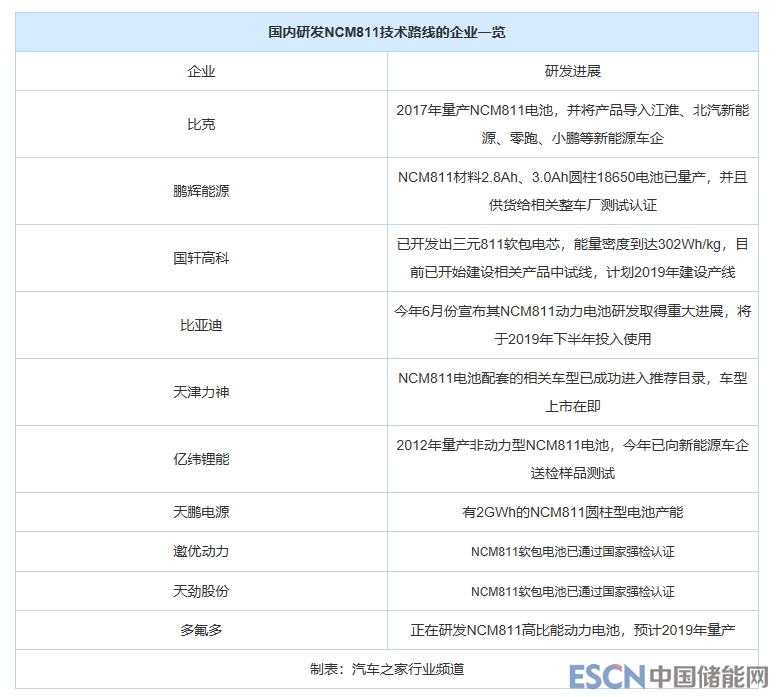 2、比克、天津力神、比亞迪、鵬輝能源、億緯鋰能等在內(nèi)的動力電池企業(yè)均投入研發(fā)生產(chǎn)NCM811技術(shù)路線。