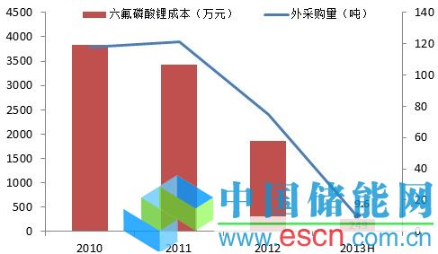 目前天賜材料生產(chǎn)的電解質(zhì)僅供自己使用,2013年上半年的外部采購量僅為9.6噸,較2011年減少92.1%,基本實現(xiàn)自給自足。
