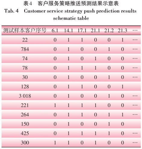通過隨機(jī)森林模型的構(gòu)建和策略推送函數(shù)判斷,得到客戶策略的預(yù)測結(jié)果?;陔S機(jī)森林分析法可以得到每一個測試樣本客戶關(guān)于每一類策略是否推送的選擇結(jié)果,其中T表示推送該策略,“0”表示不推送該策略??蛻舴?wù)策略推送結(jié)果預(yù)測示意如表4所示。
