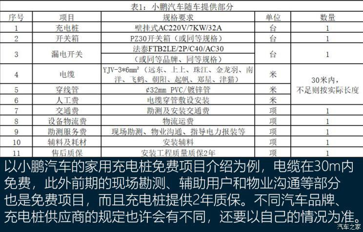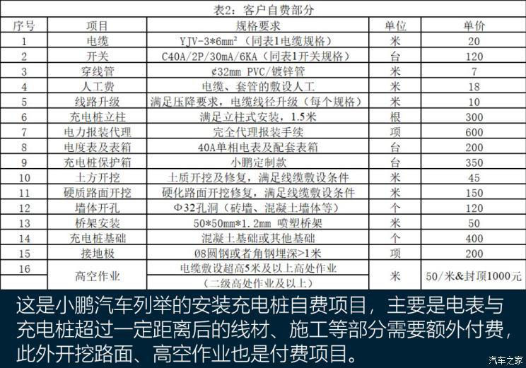 小鵬汽車也在官網(wǎng)提供了家用充電樁的相關(guān)安裝指南,其提供的服務(wù)流程不算詳細(xì),但施工的免費(fèi)、付費(fèi)項(xiàng)目列舉的十分詳細(xì),有安裝充電樁需求的消費(fèi)者可以作為參考。要額外提示的是,不同品牌的同一服務(wù)項(xiàng)目可能費(fèi)用不同,以同一規(guī)格的電纜為例,愛馳汽車收費(fèi)為40元/米,而小鵬汽車收費(fèi)僅為20元/米,所以具體施工、耗材費(fèi)用還要以我們實(shí)際充電樁供應(yīng)商的收費(fèi)規(guī)則為準(zhǔn)。